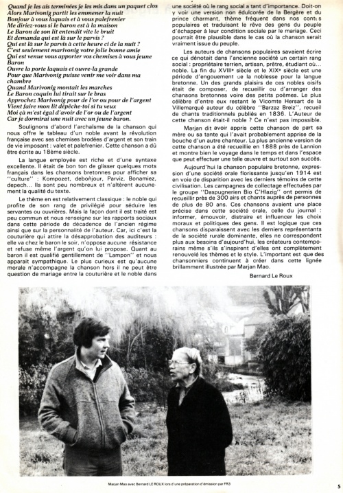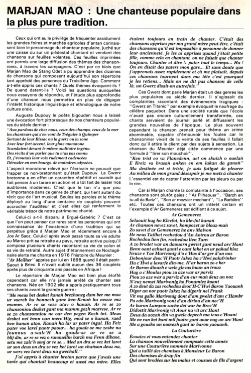 Autres lectures : « Conversation avec Marjan et Fanch Mao (1982) » ¤ « Marjann Mao, chiffonnière (Skol Vreizh, 1989) » ¤ « Fanch Mao, 96 ans, doyen d'âge de la commune » ¤ « GRALL Bernez - Kan al labour ur vuhez a vicherouzez Mari Jan Mao » ¤ « Les chants de Marjan Mao, collectage des Daspugnerien Bro C’hlazig en 1979 » ¤ « Marjan Mao, star du troisième âge » ¤ | |||||||||