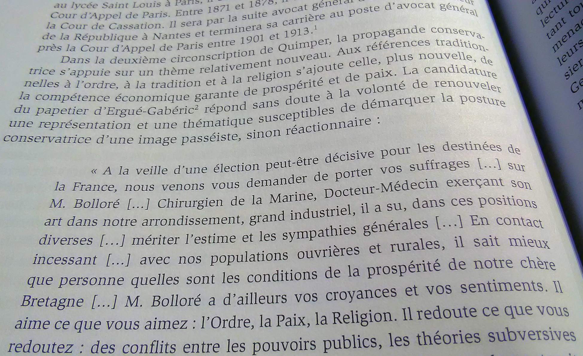 Page 122, Maurice Lucas fait l'analyse d'une contre-attaque en 1877 du clan conservateur via la candidature de Jean-René Bolloré, papetier gabéricois et originaire de Douarnenez : « Aux références traditionnelles à l'ordre, à la tradition et à la religion s'ajoute celle, plus nouvelle, de la compétence économique garante de prospérité et de paix. La candidature du papetier d'Ergué-Gabéric répond sans doute à la volonté de renouveler une représentation et une thématique susceptibles de démarquer la posture conservatrice d'une image passéiste, sinon réactionnaire ».