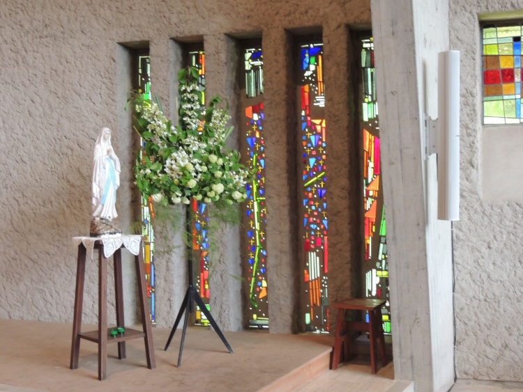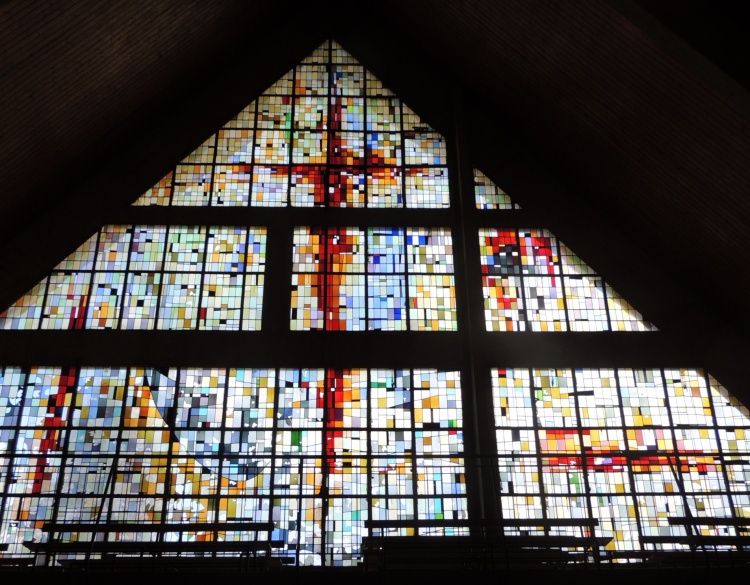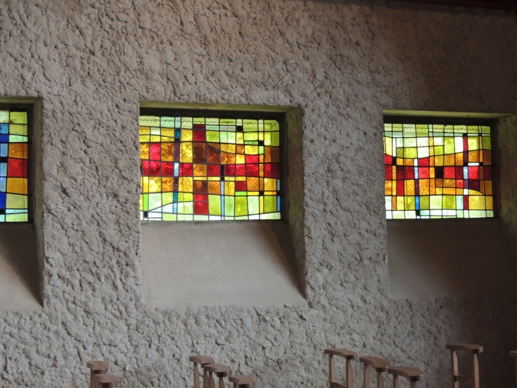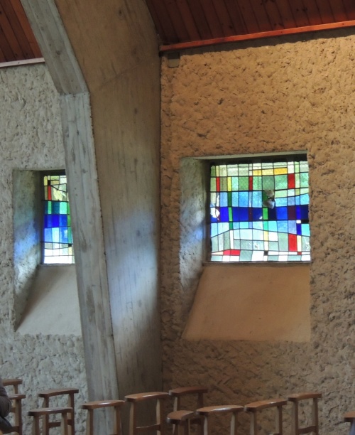 Les vitraux se répartissent en petites ouvertures non figuratives dans les murs latéraux est-ouest, et sur le pignon nord en une très grande verrière incluant les motifs colorés d'un crucifix.