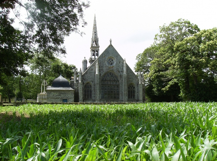 Sur la plate-forme se dressent la Croix du Christ et celles des larrons ; aux côtés du Sauveur se trouvent la Sainte Vierge et Saint Jean.Deux anges recueillent le précieux sang coulant des plaies des mains et du côté. Contre le fût Véronique tient le voile de la Vierge, et plus bas le groupe de N.-D. de pitié. Au revers on voit une Vierge-Mère, deux statues adossées à celles de la Vierge et de Saint Jean, puis Saint Michel terrassant le dragon, et enfin un « Ecce Homo ». Le jour du pardon le podium supportant l'autel est adossé à ce calvaire : les fidèles s'assemblent tout autour, dans le placître et sous les frondaisons des arbres de l'enclos. A 300 m. à l'est dans un champ se trouve la fontaine de N.-D., abritée sous un édicule gothique. L'ensemble, chapelle et enclos, est classé par les Beaux-Arts. |
