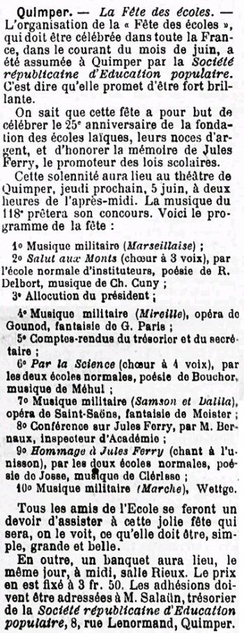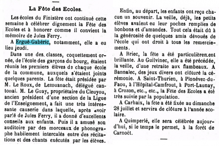 Quel contraste dans cet article du Finistère La consigne gouvernementale est de célébrer, dans toute la France et dans le courant du mois de juin, « le 25e anniversaire de la fondation des écoles laïques, leurs noces d'argent, et d'honorer la mémoire de Jules Ferry; le promoteur des lois scolaires ». La fête d'Ergué-Gabéric a lieu « dans une des classes, coquettement ornée, de l'école des garçons du bourg, (où) étaient réunis les premiers élèves de chaque école de la commune, auxquels s'étaient joints quelques parents ». |