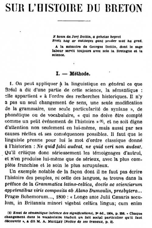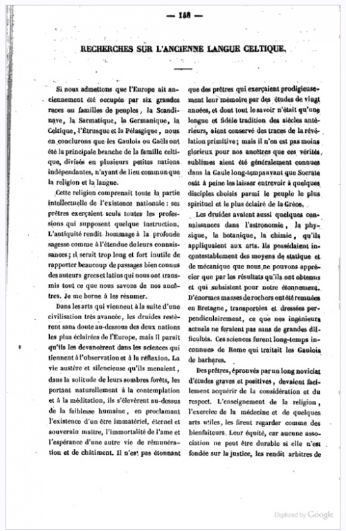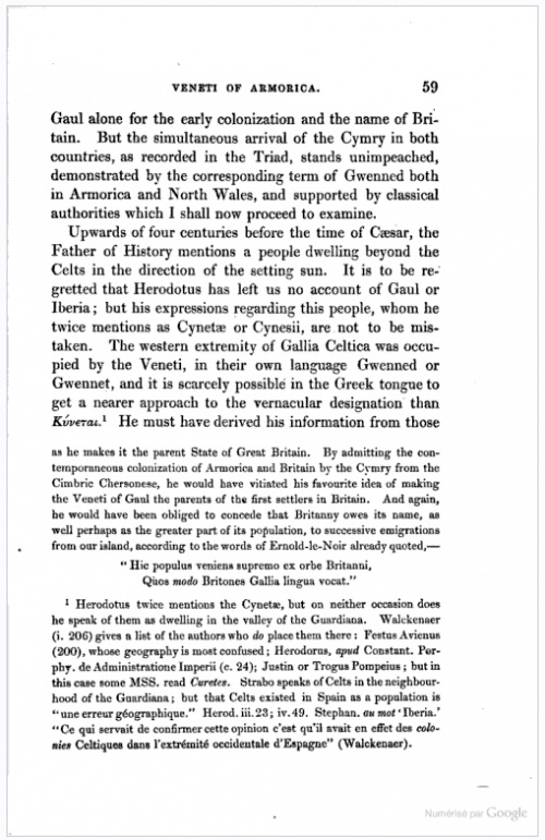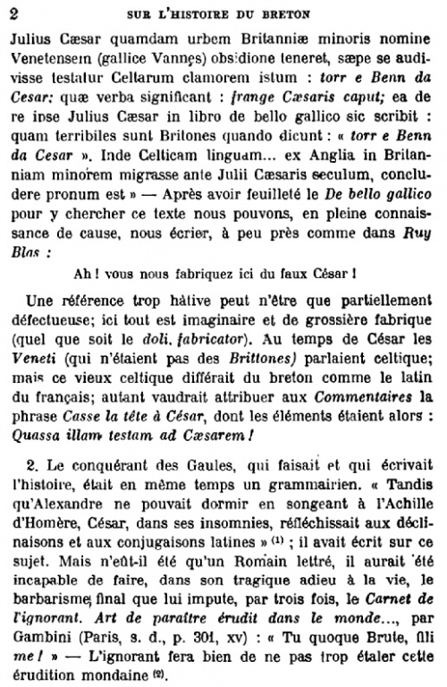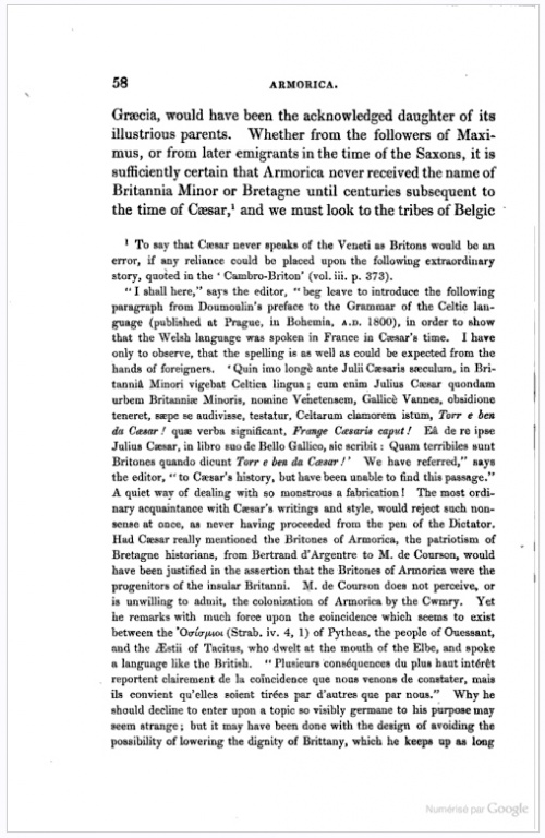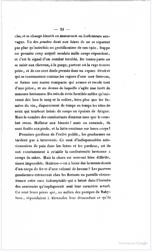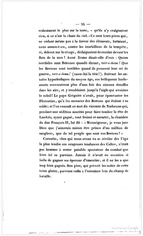 [On] retrouve chez les Bretons cette race indomptable qui a laissé dans l'histoire des souvenirs qu'expliquerait seul son caractère actuel. Ce sont leurs pères qui, au milieu des pompes de Babylone, répondaient à Alexandre leur demandant ce qu'ils redoutaient le plus sur la terre, "qu'ils n'y craignaient rien, si ce n'est la chute du ciel". Ce sont leurs pères qui, ne cédant même pas à la fureur des éléments, luttaient, nous assure-t-on, contre les tourbillons de la tempête, et, debout sur le rivage, dédaignaient de reculer devant les flots de la mer ! Aussi Rome disait-elle d'eux : Quam terribiles sunt Britones quando dicunt, torr-e-benn ! Que les Bretons sont terribles quand ils poussent leur cri de guerre, torr-e-benn (casse-lui la tête !).