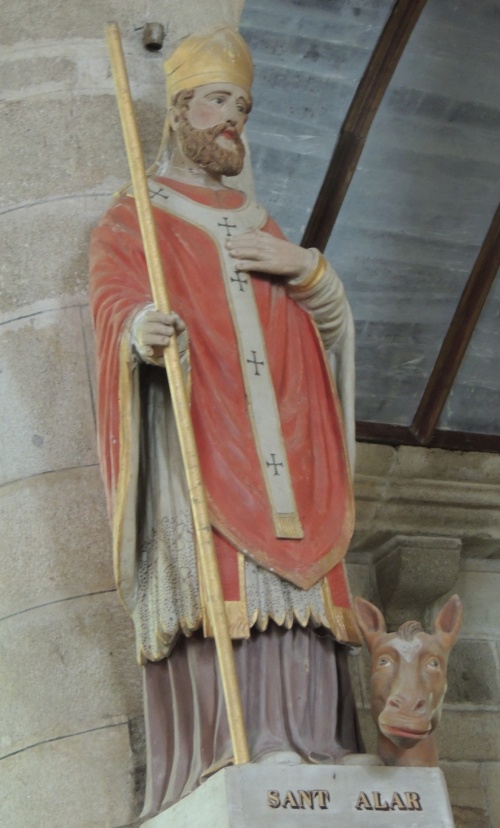 Un mystérieux évêque "Alain/Alanus" amalgamant les cultes des saints Eloi, Alain, Alar, et Alor, vénéré à la chapelle de Kerdévot et autres lieux gabéricois Ergué-Gabéric (St-Guénolé, Creac'h Ergué, Pont-Sant-Alar, Stangala). Sant Alan est fêté le 8 septembre, Saint Alar le 26 octobre et la fête des chevaux de Kerdévot avait lieu le 24 juin (une des deux fêtes de saint Eloi, l'autre étant le 1er décembre). Autres lectures : « PEYRON et ABGRALL - Notices sur les paroisses de l'évêché de Quimper et de Léon » ¤ « Sant Alar (5e siècle) » ¤ « La fontaine de saint Alar à Creac'h-Ergué » ¤ « Sant Alar (5e siècle) » ¤ « Le pardon de Notre-Dame de Kerdévot » ¤ « Les légendes du Stangala par Louis Le Guennec, Dépèche & Quimper-Cornouaille 1929-34 » ¤ « Les statues de la chapelle de Saint-Guénolé » ¤ |