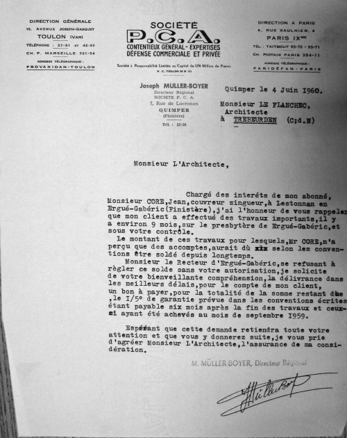L'abbé Pennarun n'est pas disposé à payer l'intégralité des sommes réclamés, il estime son dû à 8.100 francs, son argumentation étant que Roger Le Flancher avait promis de ne pas facturer le trajet Trébeurden-Quimper, car sur la même période il devait superviser le chantier de l'école St-Charles à Quimper.