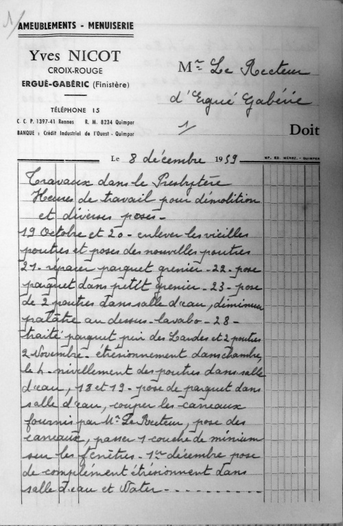 - Depuis l'Évêché c'est le chanoine Hélou qui supervise le chantier de reconstruction du presbytère d'Ergué-Gabéric. Le Flanchec précise : « J'ai été amené à faire 7 ou 8 plans successifs de travaux que je soumettais à l'abbé Pennarun, curé d'Ergué-Gabéric et à M. le Chanoine Hélou, qui est secrétaire général de l'Évêché. Ces plans que je proposais, quand ils recevaient l'approbation de l'un, étaient rejetés par l'autre. ». [Ref.↑]