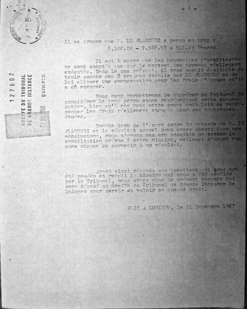 - Après le jugement de 1971 Le Flanchec envisage de poursuivre légalement l'expert architecte de Lorient mais il renonce et abandonne par la suite [Ref.↑ 4,0 4,1]