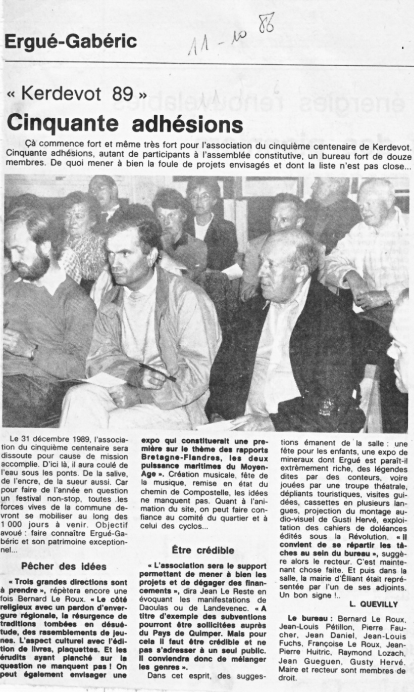 | Le 11 septembre, le 11 octobre 1986 paraissaient dans les colonnes du Ouest-France des articles de Laurent Quevilly sur le lancement du projet de commémoration Kerdévot 1989.