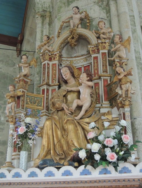 Il y a dans la chapelle un retable doré très ancien et restauré à plusieurs occasions. Ses quatre scènes d'origine en T inversé sont passées par les mains d’ateliers flamands du 15e siècle : « Le retable de Kerdévot n'est pas une œuvre exclusivement anversoise et du XVIe siècle comme on l'a souvent dit, mais un travail mixte de la fin du siècle précédent » (Gildas Durand La suite : « Les marques de fabrique des ateliers flamands du 15e siècle sur le retable de Kerdévot » ¤ La statue de Notre-Dame de Kerdévot est aussi une pièce incontournable qui a été remise en perspective par Gildas Durand Son article complet sur la statuaire de Kerdévot est publié en 1989 dans le cadre du cinquième centenaire de la chapelle de Kerdévot. Il est complété par une étude parue en parallèle dans les dossiers du Centre régional archéologique d'Alet. Pour lui, la provenance de la maestà de Kerdévot n'est pas flamande comme l'autre oeuvre majeure de Kerdévot (le retable) : « Toutes les références nordiques que l’on pourrait trouver à An Intron Varia Kerdevot sont des œuvres italianisantes. C’est bien en Italie qu’il faut chercher des répondants à l’œuvre d’Ergué-Gabéric ». Elle correspond au thème iconographique de la « Maestà », très en faveur à la fin du Moyen-Age et à la Renaissance. La Maestà est un terme italien désignant la Vierge Marie en majesté et de face, dans une attitude hiératique, assise sur un trône, entourée d'anges, et portant éventuellement son enfant Jésus. La représentation du trône y est matériellement importante et imposante. À partir de 1525-30 les ateliers d’art flamands ont produit des œuvres de Maestà entourée d’angelots. Les visages de la Vierge et des angelots ne sont ni bretons, ni nordiques. Le drapé, nullement flamand, est lui aussi italien dans son rejet des cassures trop marquées. Le voûtement du trône par une grande valve de coquille saint Jacques se retrouve notamment dans les oeuvres de Botticelli et Cosmé Tura. La comparaison à d’autres réalisations italiennes apporte des éléments pour déterminer la date de la statue de Kerdévot. Par exemple en 1488, la Vierge de Lorenzo Costa avec ses angelots musiciens et motifs all'antica. La Maestà d’Allesandro Botticelli de Florence date de 1487. La conception du trône fait penser à celui d’Ercole de Roberti réalisé en 1475. |