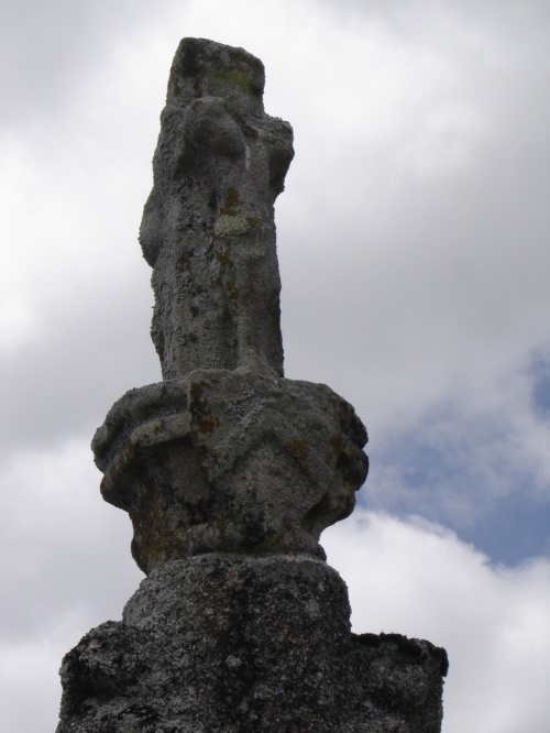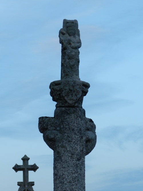 Ce calvaire du 16e siècle, avec un Christ et une Vierge à l'Enfant en exposition sur une croix démunie de ses branches, se trouve actuellement à l'entrée du cimetière communal sur la tombe familiale des Le Guay du Cleuyou. Sur le socle on y lisait l'inscription « 1553 FUT FET CE CROSE » selon Louis Le Guennec, ou « 1553 FUT FET CEST » selon Y.-P. Castel. Au sommet du fût, on distingue deux écus adossés, l'un représentant un chevron, l'autre une croix potencée, ce dernier blason pouvant être les armes de la famille Cabellic (11e-12e siècles), ou alors une tête de Maure comme l'a dessiné Louis Le Guennec dans les années 1930. On observe également des statues de monstres au-dessous du chapiteau de part et d'autre du fût. Le calvaire provient du lieu-dit de Kerampensal et fut déplacé en 1942 par Louis Le Guay sur la charrette de Youenn Quillec de la ferme de Ti-Nevez-Cleuyou. Elle était dressée au bord de l'ancienne route du Bourg, près de la ferme de Kerpensal. Située à une lieu gauloise (2222 mètres) de la ville de Quimper, la croix de Kerpensal était peut-être la première milliaire de la voie romaine de Carhaix. Au début du 20e siècle on l'appelait la croix des trois ivrognes du fait qu'elle se trouvait centrée par rapport à 3 fermes voisines où il était notoire que quelqu'un abusait de la boisson. Mais les anciens la connaissaient aussi comme croix de mission car on y allait régulièrement y faire des dévotions. |