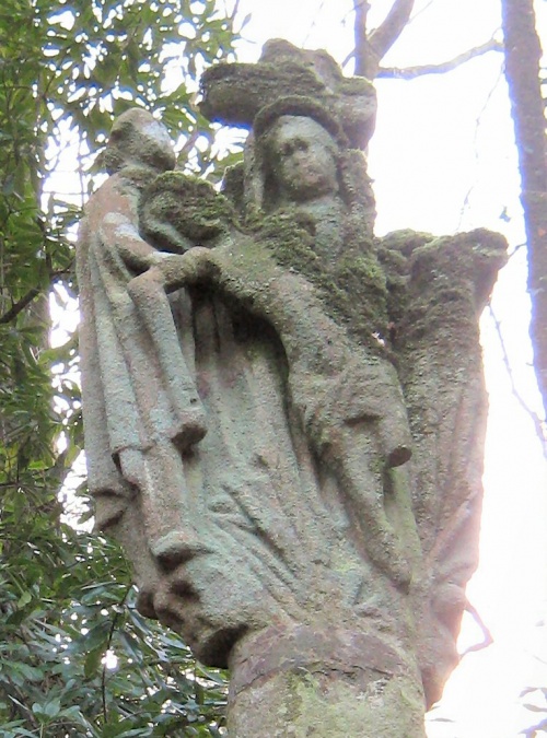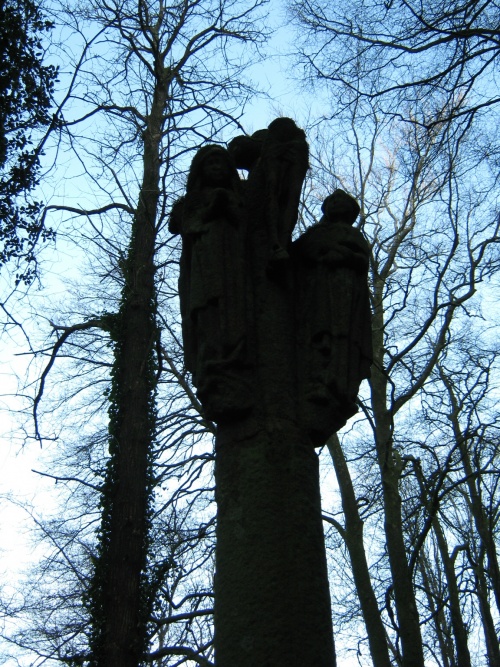 Le fût rond est surmonté d'un ensemble important dont une petite croix. Il ne reste du Crucifié que le bas de son corps. De part et d'autre de la croix sont érigées deux hautes statues de la Vierge et de Saint-Jean. Au dos est représentée une descente de croix avec trois personnages autour du corps du Christ. A la base des statues, on distingue du ciment, marque d'une restauration, sans doute l’œuvre des maçons Jean-Marie Quéré et Jean-Louis Favennec, employés de la papeterie d'odet, réquisitionnés pour ce genre de travaux. | |