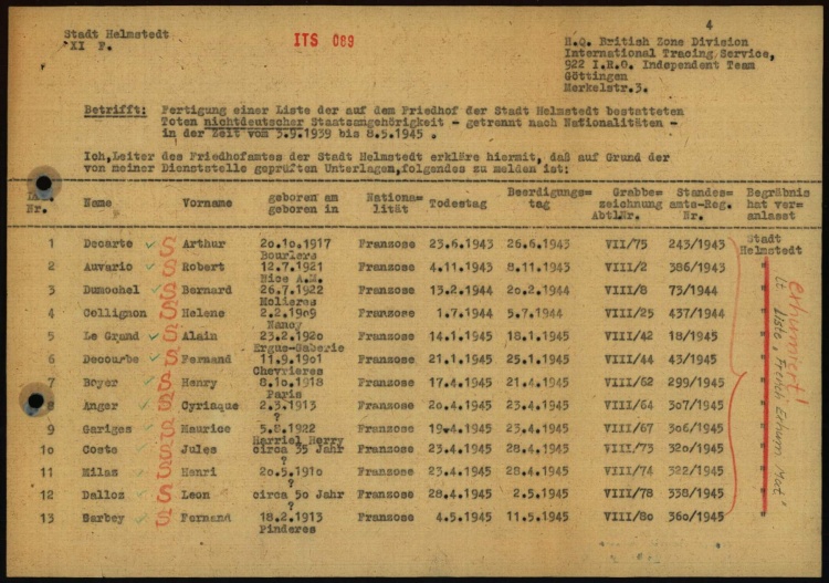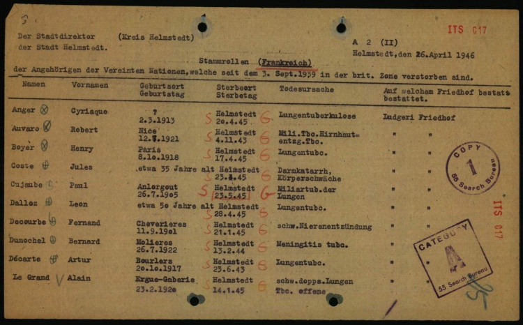 | Le dossier des Archives Arolsen [1] concernant Alain Le Grand, né le 23.02.1920 à Kerroué, mentionné dans deux listes d'étrangers établies à Helmstedt en zone britannique après la fin de la guerre, déclaré mort le 18.01.1945 des suites d'une affection des poumons et honoré honoré plus tard comme « Mort pour la France ».