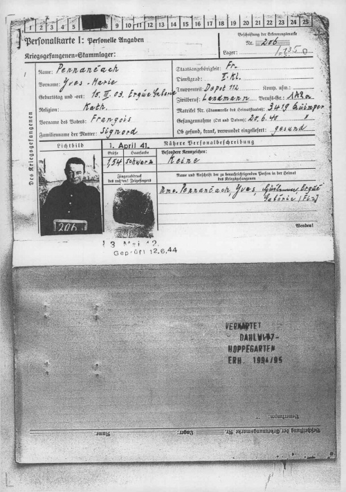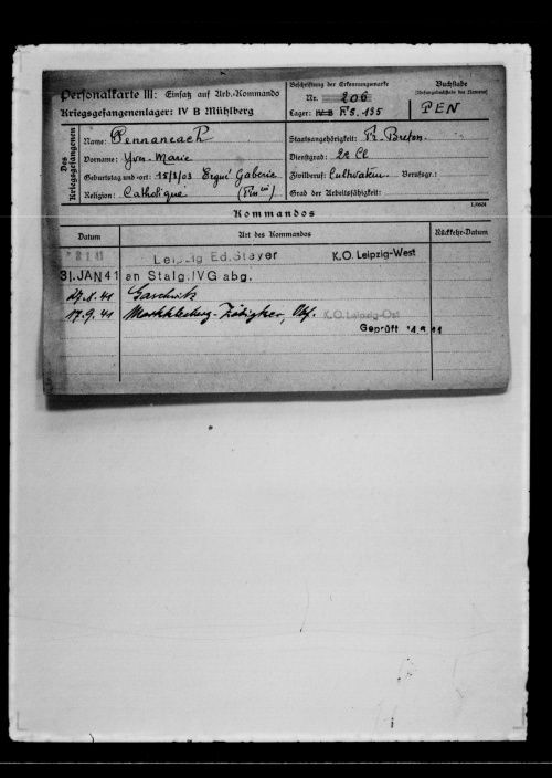 Yves-Marie Pennaneach est né le 15.03.1903 à Quélennec Son dossier est constitué de deux cartes personnelles de prisonnier de guerre mentionnant son état militaire de 2e classe, sa profession cultivateur (« <i>Landman »), arrêté le 20.06.40, son arrivée le 31.01.1941 au stalag IV C de Wistritz (République tchèque), ses deux crises de typhus en 1942 et 1944, sa photo-portrait et empreinte digitale. |