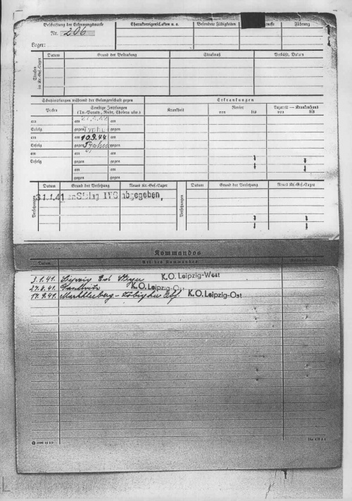 | Le dossier des Archives Arolsen [1] concernant Yves-Marie Pennaneach, né le 15.03.1903 à Quélennec, prisonnier de guerre, soldat de 2e classe, arrêté 20.06.40, arrivé le 31.01.194 au stalag IV C de Wistritz (République tchèque), deux crises de typhus en 1942 et 1944, photo-portrait et empreinte digitale.