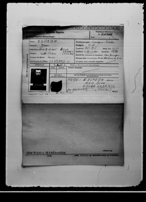 Jean Espern est né le 09.12.1915 à Loqueltas Son dossier est constitué d'un carte personnelle de prisonnier de guerre mentionnant son état de service militaire de 2e classe au 85e RI, sans mention de son stalag d'affectation, profession de cultivateur, arrêté à Corcieux le 23.06.1940, photo-portrait, empreinte digitale et tampons datés du 01.04.1941, 03.05.1942 et juin 1944. |