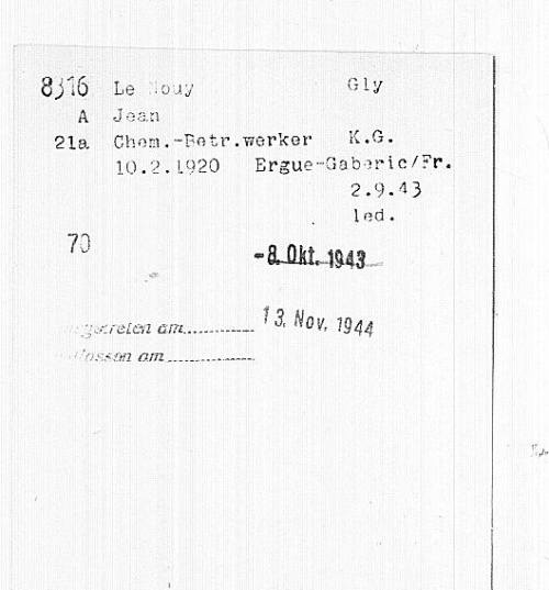 Jean Le Nouy est né le 10.02.1920 à L'Hotel Son dossier est constitué d'une fiche cartonnée incluse dans l'index nominatif des employés de l'entreprise de chimie Kalle à Wiesbaden-Biebrich avec le statut K.G. (Kriegsgefangener : prisonnier de guerre) et des tampons datés du 08.10.1943 et du 13.11.1944. |