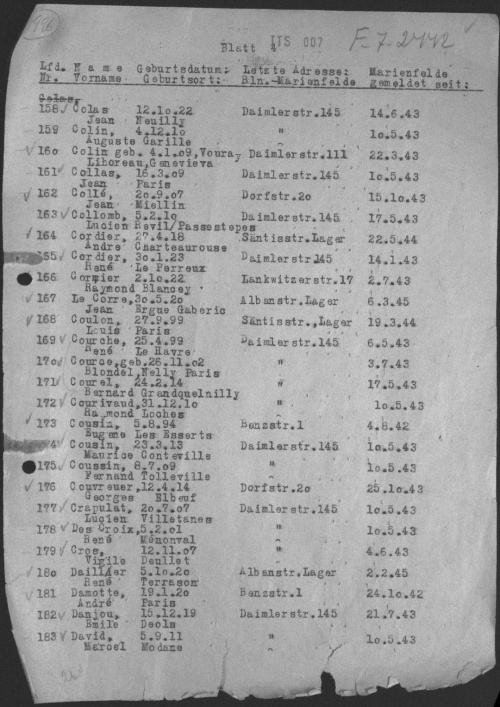 | Le dossier des Archives Arolsen [1] concernant Jean-Marie Le Corré, né à Menez-Groaz le 30.05.1920 , signalé le 6 mars à Lager dans le land du Brandebourg (est de l'Allemagne).