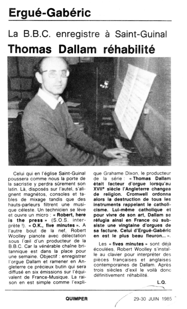 | Le 30 juin 1985, paraissait dans les colonnes du Ouest-France un article écrit par Laurent Quevilly sur l'enregistrement par la BBC de morceaux joués sur l'orgue de l'église paroissiale.