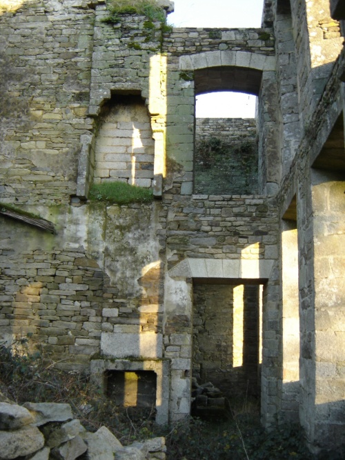 Plus important [a] était le château de Lézergué à un kilomètre au nord du bourg, massive construction du XVIIIe siècle, aujourd'hui convertie en ferme et en partie découverte. Sa sévère façade de granit, à laquelle des lichens verdâtres donnent une patine de bronze, est relevée aux extrémités de deux pavillons décorés d'un fronton courbe offrant à son tympan les armoiries de la famille de La Marche : de gueules au chef d'argent. L'escalier de pierre, au fond du large vestibule, monte au palier dallé du premier étage en formant une voûte plate des plus hardies ... Ce noble château, fier encore dans sa ruine, fut construit sous Louis XIV par les de La Marche, qui habitaient précédemment le manoir voisin de Kerfors.