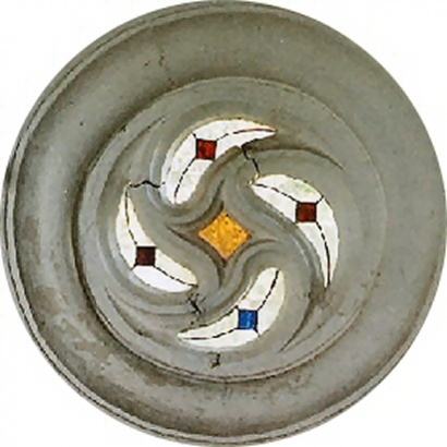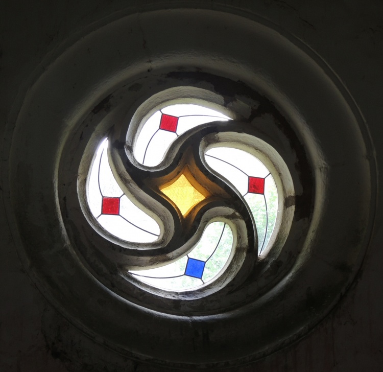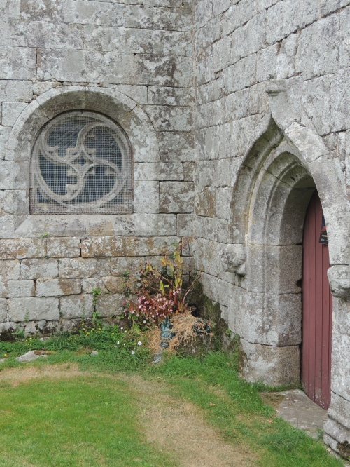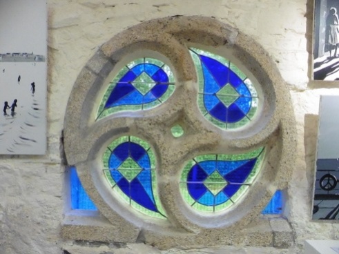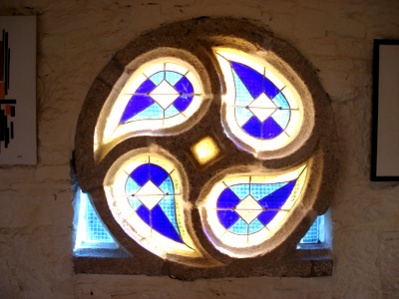 Et enfin la chapelle St-Fiace, à l'origine à Kerspen sur la commune de Riec sur Belon, et transportée au Cabellou en 1936. Ses vitraux, notamment ce très beau quadriskell du vitrail sud, ont été restaurés en 2001-2004. |