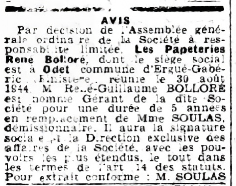 AVIS. Par décision de l'Assemblée générale de la Société à responsabilité Les Papeteries René Bolloré, dont le siège social est à Odet commune d'Ergué-Gabéric (Finistère), réunie le 30 août 1944, M. René-Guillaume BOLLORÉ est nommé Gérant de la dite Société pour une durée de 5 années en remplacement de Mme SOULAS, démissionnaire. Il aura la signature sociale et la Direction exclusive des affaires de la Société, avec les pouvoirs les plus étendus, le tout dans les termes de l'article 14 des statuts. Pour extrait conforme : M. SOULAS.