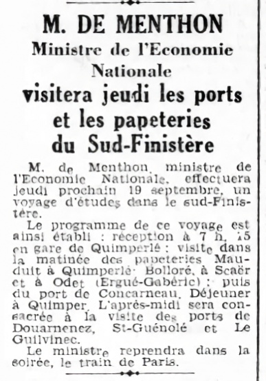 M. de Menthon Ministre de l’Économie Nationale visitera jeudi les ports et les papeteries du sud-Finistère.