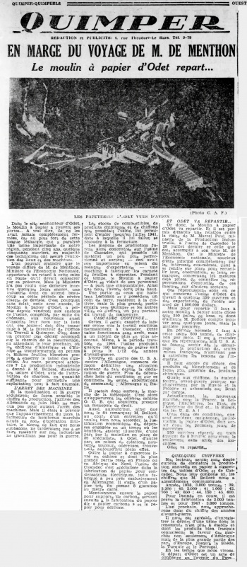 Or donc, le Moulin à papier d'Odet va repartir. Et il est permis d'établir une relation entre la visite de M. Marcel Paul, ministre de la Production Industrielle, à l'usine de Cascadec le 28 juillet dernier et celle que doit accomplir à son tour M. de Menthon. Car le Ministre de l’Économie nationale, soucieux d'être informé complètement par les intéressés eux-mêmes, tient à se rendre sur place pour recueillir leurs observations, et leurs remarques concernant les mesures déjà prises, de connaître les répercussions éventuelles de ces mesures sur d'autres secteurs.