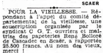 SCAËR. Pour la vieillesse. Répondant à l'appel du comité départemental de la vieillesse, une souscription organisée par le syndicat C.G.T. ouvriers et maîtrise des papeteries René Bolloré de Cascadec en Scaër, a rapportée 25.500 francs. Au nom des vieux, merci !