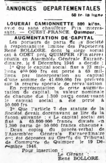 Annonces départementales. Augmentation de capital. Les porteurs de parts de la Société à responsabilité limitée des Papeteries René BOLLORÉ, dont le siège social est à ODET près QUIMPER (Finistère) réunis en Assemblée Générale Extraordinaire, le 6 Décembre 1946 a décidé :