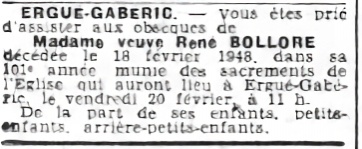 ERGUE-GABERIC. - Vous êtes prié d'assister aux obsèques de Madame veuve René BOLLORÉ décédée le 18 février 1948 dans sa 101e année munie des sacrements de l’Église qui auront lieu à Ergué-Gabéric, le vendredi 20 février à 11h. De la part de ses enfants, petits-enfants, arrière-petits-enfants.