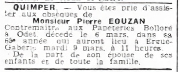 QUIMPER. - Vous êtes prié d'assister aux obsèques de Monsieur Pierre ÉOUZAN Contremaître aux Papeteries Boilloré à Odet décédé le 16 mars dans sa 63e année qui auront lieu à Ergué-Gabéric, mardi 9 mars à 11h. De la part de son épouse, de ses enfants et de toute la famille.