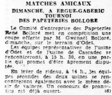 Le Comité d'entreprise des Papeteries René Bolloré met en compétition une coupe offerte par M. Gwénaël Bolloré, dimanche, sur le terrain d'Odet. Les équipes représentatives de l'usine d'Odet et de l'usine de Cascadec se rencontreront, à 15 h 30, en une partie qui promet d'être âprement disputée. En lever de rideau, à 14 h., les équipes secondes des deux usines se rencontreront également avec le même désir de vaincre. Un concours de pronostics est déjà ouvert.