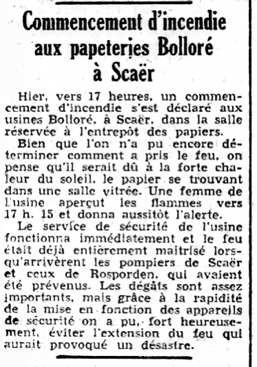 Le service de sécurité de l'usine fonctionna immédiatement et le feu était déjà entièrement maîtrisé lorsqu'arrivèrent les pompiers de Scaër et ceux de Rosporden, qui avaient été prévenus. Les dégâts sont assez importants, mais grâce à la rapidité de la mise en fonction des appareils de sécurité on a pu, fort heureusement, éviter l'extension du feu qui aurait provoqué un désastre.
