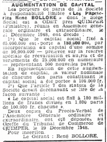 Augmentation de capital. Les porteurs de parts de la Société à responsabilité limitée « Les Papeteries René BOLLORÉ » dont le siège social est à ODET près QUIMPER (Finistère) réunis en Assemblée générale ordinaire et extraordinaire, le 21 Décembre 1948 a décidé :