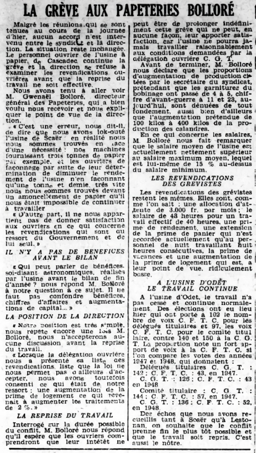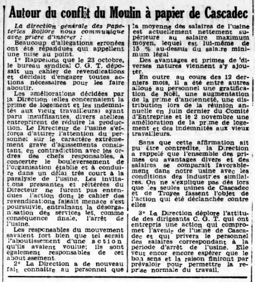 3° La Direction déplore l'attitude des dirigeants C.G.T. qui ont entrepris une action qui compromet l'avenir de l'usine de Cascadec et qui privera le personnel des salaires correspondant à la période d'arrêt de l'usine. Elle veut encore espérer que le bon sens et la raison finiront par prévaloir pour permettre la reprise normale du travail.