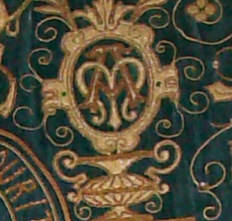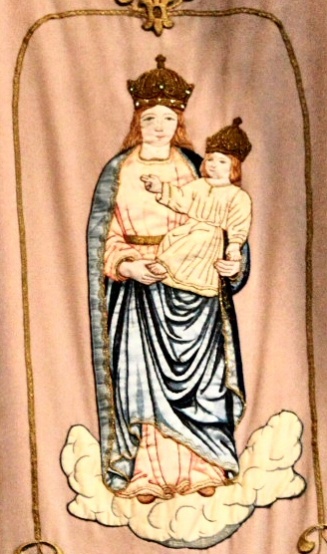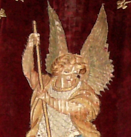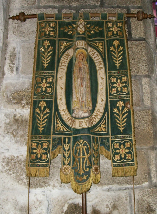 Inscription ITRON VARIA FATIMA PEDIT EVIDOMP ( Notre-Dame de Fátima, Priez pour nous). Monogramme marial A.M. (« Auspice Maria », sous la protection de Marie) Fátima est une petite ville portugaise située dans le District de Santarém. La ville devient célèbre en 1917, quand trois jeunes bergers auraient été témoins à plusieurs reprises d'une apparition mariale. Ces apparitions ont donné naissance au sanctuaire de Notre-Dame de Fátima, lieu d'un célèbre pèlerinage catholique. | [modifier] 2.4 Bannière rouge de saint MichelDatation : 1919-20 Matière : Velours rouge, broderie or et argent.