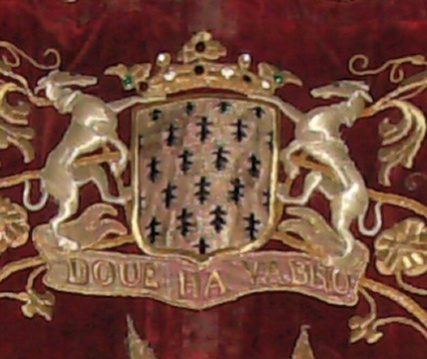 Inscription : ITROUN VARIA KERDEVOT PEDIT EVIDOMP (Notre-Dame de Kerdévot Priez pour nous). Armoiries épiscopales de Benoît XV | [modifier] 2.6 Bannière rouge de saint GuinalDatation : 1945-1947 Matière : velours rouge.