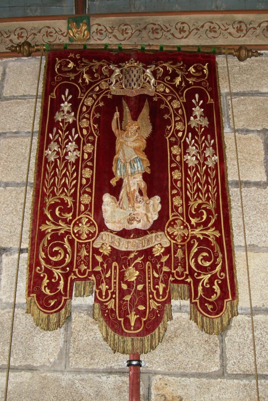 Inscription : QUIS UT DEUS, "Qui est comme Dieu" Armoiries ducales de Bretagne d'hermine plain, deux lévriers colletés, devise DOUE HA VABRO (Dieu et mon Pays). L'archange terrasse de sa lance, non pas un dragon, mais Satan représenté en ange déchu dont on ne voit que le beau visage, deux ailes, et le trident. Initiales : M.G. en haut à gauche du donateur Michel Le Goff de Sulvintin à son retour de la guerre 1914-18. Michel Le Goff, de la classe 1913, a été blessé au front par deux fois, reçu deux citations individuelles, et une collective, et reçut un certificat de bonne conduite le 8 juillet 1919. Dans sa famille, la bannière de saint Michel était appelée « la bannière de Papa ». | |||||||||||||||||||||||||||||||