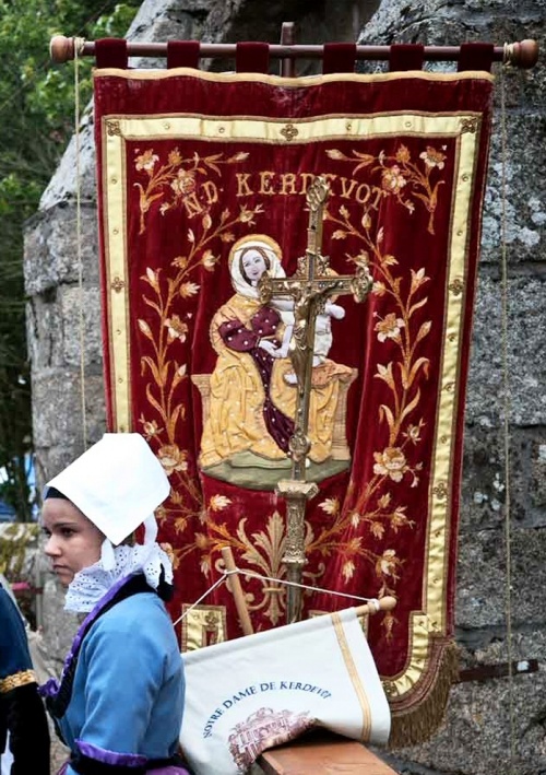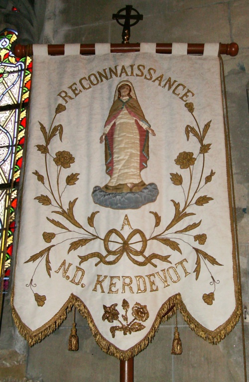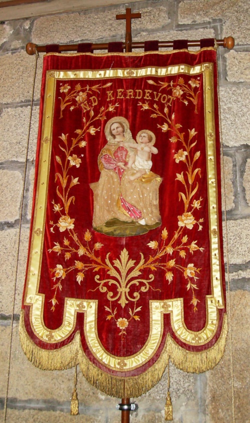 Inscription : ITROUN VARIA KERDEVOT / SIKOURIT AC' HANOMP. (Notre-Dame de Kerdévot, Aidez-nous) Figures : Vierge à l'Enfant assise, couronnée, vêtue de rouge et d'or. Monogramme marial AM ( « Auspice Maria », sous la protection de Marie) Armoiries : Blason de Bretagne, d'hermine plain, couronne ducale, deux lévriers, et armoiries pontificales En 1899 Anatole Le Braz assiste au pardon de Kerdévot et il écrit : « Les hommes sont debout ; les bannières droites dans la balustrade. L'une d'elles, blanche, avec une image en or est l'Intron Varia Kerzevot. D.E.D. On lui a mis derrière une Vierge de Lourdes qui, bientôt sans doute la supplantera ». On peut supposer que cette ancienne bannière blanche est dans un état vétuste qui ne lui permettra pas d'être porté lors des prochaines processions, et que la bannière de velours bleu ne soit sans doute commandée pour la remplacer. Restauration par des brodeuses de la paroisse ayant suivi une formation auprès de l'École de broderie d'art de Kemper créé en 1995 par Pascal Jaouen. |