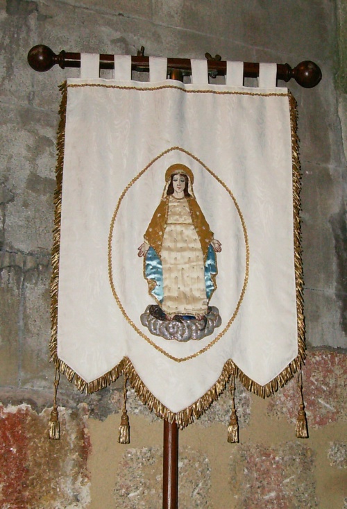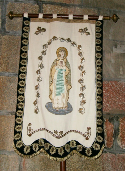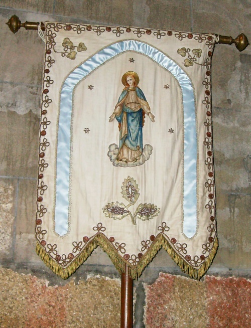 [modifier] 2.1 Bannière bleue de ND de KerdévotDatation : entre 1878 et 1903 Matière : Velours bleu, fil d'or, soie.