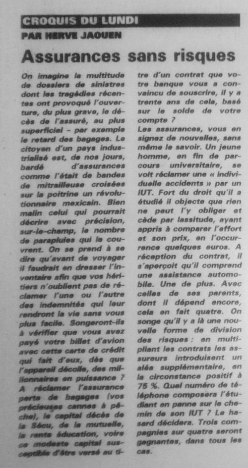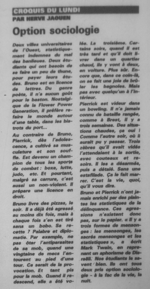 L'écrivain gabéricois 09/08/1999 - Des chrysanthèmes pour Miss Blandish 23/08/1999 - Le blues des îles 03/01/2000 - Tuer le temps 10/01/2000 - Les gros mots 13/03/2000 - Saint Patrick 27/03/2000 - Deguignet et le polar régional 03/04/2000 - Wanted 15/05/2000 - Tir à balles réelles 20/11/2000 - Avarice et prodigalité 08/10/2001 - Assurances sans risques 25/02/2002 - Poignées de main 12/05/2003 - SPAB Un billet de mars 2000 reprend une actualité locale, la publication des mémoires du paysan bas-breton Déguignet : « Notre région, ces derniers mois, a été marquée par deux phénomènes : le succès, aussi considérable qu'imprévu, des Mémoires d'un paysan bas-breton de Jean-Marie Deguignet, et la multiplication de titres dans un genre qui fait florès, et qu'on pourrait appeler le nouveau polar régional breton. § Quels liens ... Oui, Deguignet tend enfin à la Bretagne ce miroir dans lequel elle n'osait pas se regarder. Sauf que ce miroir est celui du passé. Mais c'est déjà un grand pas vers la guérison d'une espèce de presbytie collective qui fait que nous nous voyons plus beaux de loin que de près. » |
