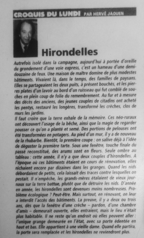 Tous les lundis matin, de mai 1999 à juillet 2003, Hervé Jaouen Ces croquis ont fait l'objet en 2004 d'une publication intitulée « Chroniques d'hier et d'aujourd'hui. Autres lectures : « JAOUEN Hervé - Chroniques d'hier et de demain » ¤ « JAOUEN Hervé - Les Filles de Roz-Kelenn » ¤ |