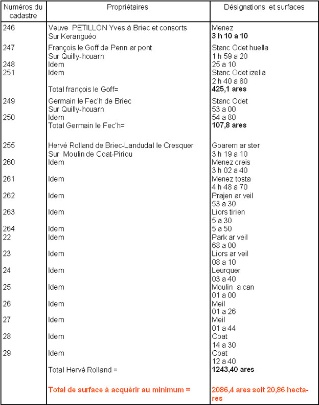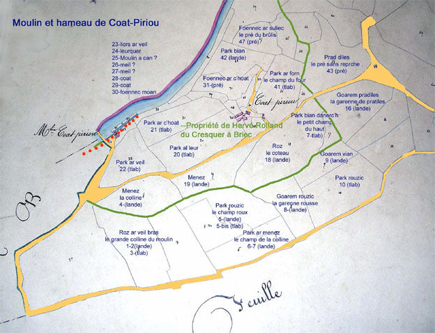 -On remarque que Hervé Rolland ,cultivateur du hameau du Cresquer est le principal propriétaire concerné . Sa ferme se situe juste en face du moulin de Coat-Piriou coté Landudal .Il n’habite donc pas au moulin .(cartes page précédente et présente).