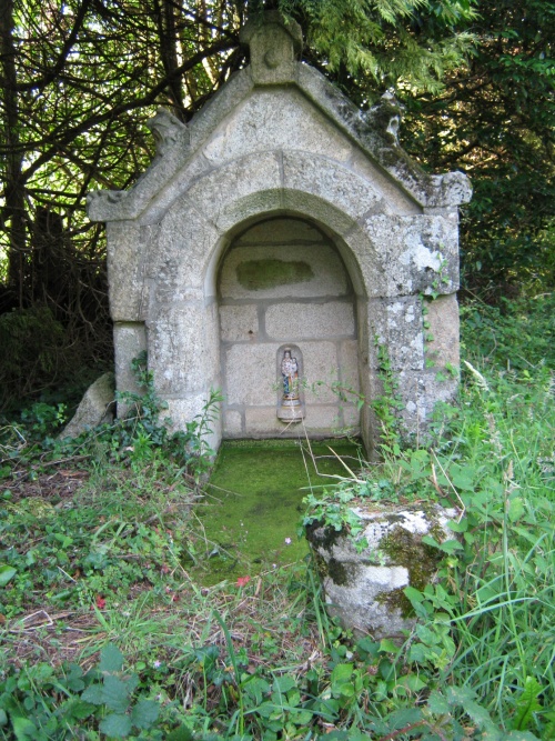 Une source et fontaine se trouvant en face du chemin de Kerdudal (proncez "Kerzudal"), dont l'eau était réputée, mais actuellement perdue dans un creux de végétation ; par temps clair on devine le muret de pierres en arc de cercle. Une source perdue en plein bois de l'usine à Stang Odet ; l'eau s'écoule d'une faille d'une grosse pierre placée sous les racines d'un arbre et alimentait un lavoir. |