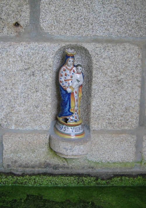 | Près du carrefour marquant l'entrée depuis Quimper sur le territoire d'Ergué-Gabéric, au lieu-dit de Coutilly, cette fontaine ornée d'une statue de Marie. Elle était placée en bordure de la propriété de la métairie du Chartier, connue jusqu'au sous le nom du moulin à Couteaux.