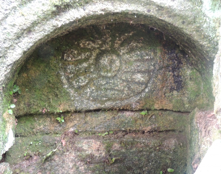 La fontaine de Kervreyen, toujours en eau, est communément appelée la « fontaine du roi soleil » car un soleil stylisé est gravé sur sa pierre intérieure. La fontaine est visible, moyennant un défrichage des orties et des herbes folles. La pierre arrondie en arc au-dessus de la source est en place, et des pierres ouvragées en aval bloquent l'eau, tout en laissant le filet s'écouler vers la zone basse humide. De part et d'autre d'autres pierres sont tombées, et il serait intéressant de compléter le puzzle de l'ouvrage. Les anciens des villages avoisinants se rappellent de ce lieu comme d'un endroit rafraîchissant par grande chaleur. Et ils se souviennent aussi qu'entre la fontaine et le petit étang le cresson était abondant et apprécié. |
