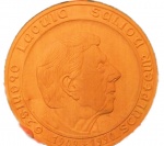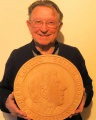 Tout d'abord, ce médaillon en bois de 40cm réalisé en 2019 Hervé Saliou, cousin de Laouic et également sculpteur. On remarque son sourire qui évoquait celui de Fernandel et on y lit « Laouic Saliou sculpteur ébéniste 1909-1990 », Laouic étant le diminutif breton de Guillaume. « Ses enfants m’ont demandé un médaillon duquel sera tiré un bronze, qui sera posé sur sa tombe », explique Hervé Saliou dont le parcours présente de curieuses similitudes avec celui de son lointain parent.