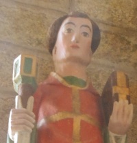Un saint avec un étrange chapeau et des bandelettes latérales, une chasuble bleutée et bande dorée, une étole marron, une dalmatique blanche et marron, un livre sacré et une gros cordelette sur le devant. Du fait du manque d'attributs comme une enclume ou des habits épiscopaux, l'attribution à saint Alar est incertaine, contrairement à la statue de saint Alain à la chapelle de Kerdévot.
