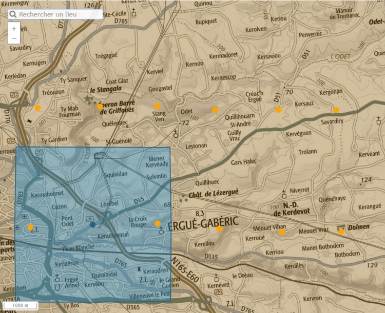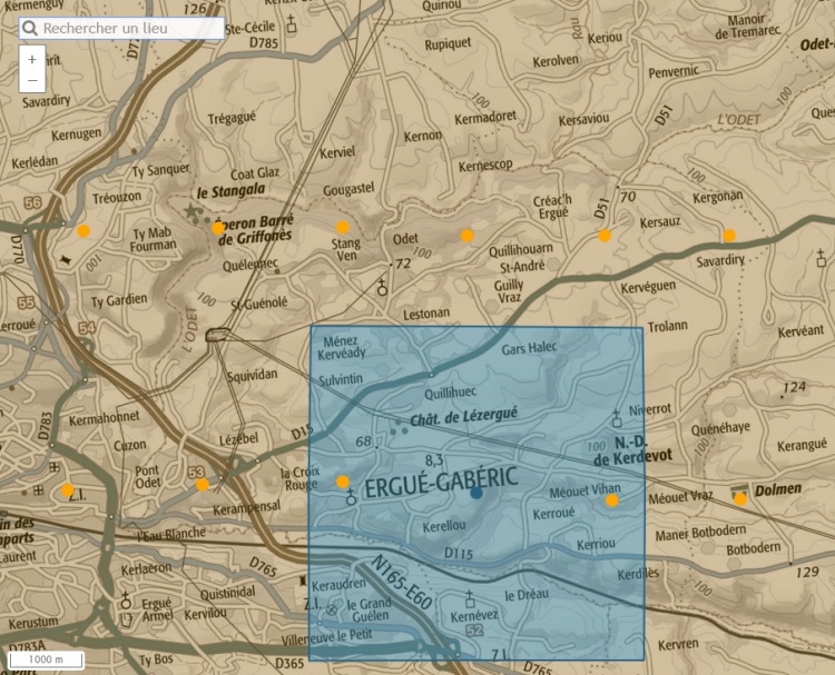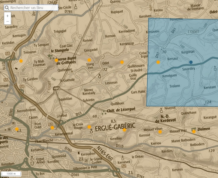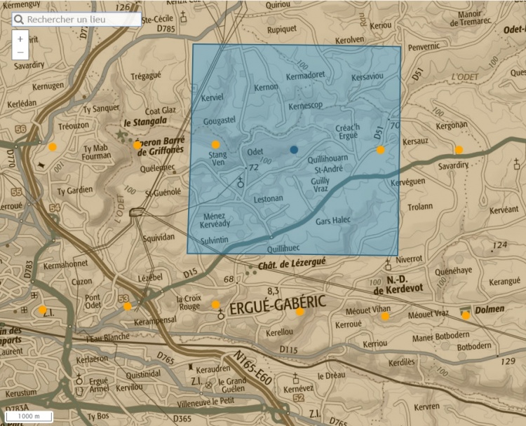 | À partir de 1946, l'IGN (Institut Géographique National) a fait voler ses avions photographes, notamment les célèbres Boeing B-17, sur le territoire français et d'outre-mer afin de prendre des clichés des villes et campagnes ; le 22.08.1978 une prise de vue argentique N&B au 1/20075 a été menée en survol de la commune d'Ergué-Gabéric.