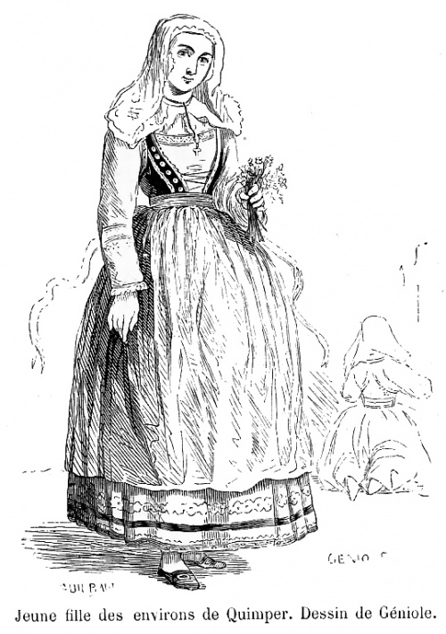Alfred de Courcy, en publiant en 1842 une étude sur le Breton, rassembla un certain nombre de dessins mettant en scène des bretons et bretonnes en costume. Et notamment le croquis du peintre et professeur de dessins Prosper Saint-Germain titré « Paysanne des environs de Quimper ». Du dessin publié en noir et blanc, Victor Goindre La coiffe était constituée de drap de lin, et non de lingerie brodée comme cela s'est généralisé par la suite, et un bandeau rouge sur le front amène une touche d'originalité. Dans le vêtement on voit également les trois corsages superposés qui composaient traditionnellement l'habit des jeunes filles. Le tablier est assortis de jolis couleurs gaies qui tranchent avec le noir et les bandelettes rouges du bustier. On notera aussi page 173 de l'article d'Alfred de Courcy, un autre dessin de Saint-Germain illustrant le début de diversité des coiffes bretonnes en ce milieu du 19e siècle, ainsi qu'une autre gravure d'Alfred Geniole page 76 représentant également une jeune fille des environs de Quimper portant le même type de coiffe que celle d'Ergué-Gabéric.