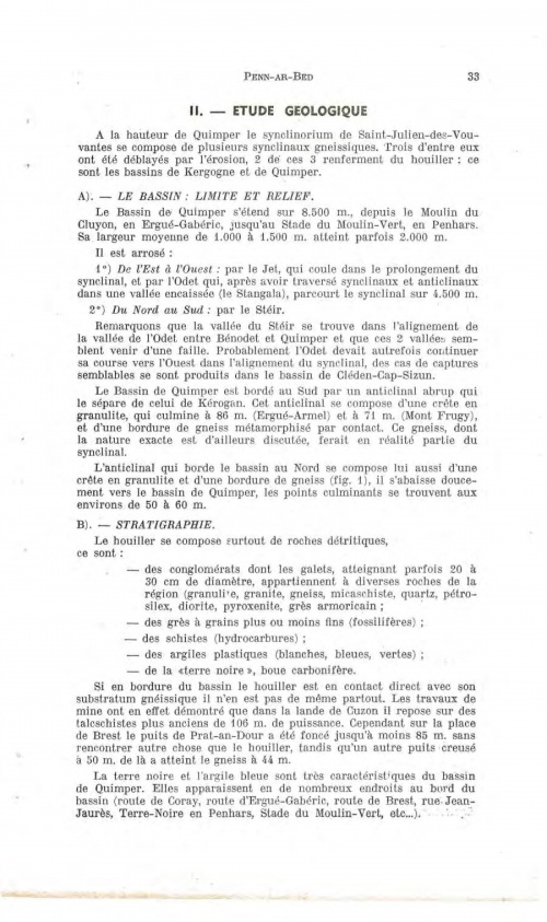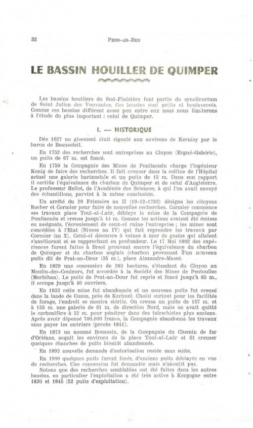 La revue Penn ar Bed qui existe depuis 1953 est considérée aujourd'hui comme l'encyclopédie sur la nature en Bretagne, et tout particulièrement le Finistère. L'article de septembre 1975 est signé Bernard Mulot Il rappelle notamment les premiers travaux de recherches minières : « Les affleurements charbonneux du bassin quimpérois furent véritablement découverts par le géologue L'article de Bernard Mulot est illustré de coupes, plans et cartes des sites explorés et anciens puits. Article complet : PAB_mulot_1975_82.pdf Autres lectures : « 1812-1829 - Un bassin houiller délimité à l'est par le puits et dépôt du Cluyou » ¤ « LE GRAND Alain - Quimper-Corentin en Cornouaille » ¤ « 1829 - Etat du chemin vicinal à la Terre Noire près du Cleuyou » ¤ « RIVIERE Alphonse-Auguste - Études géologiques faites aux environs de Quimper » ¤